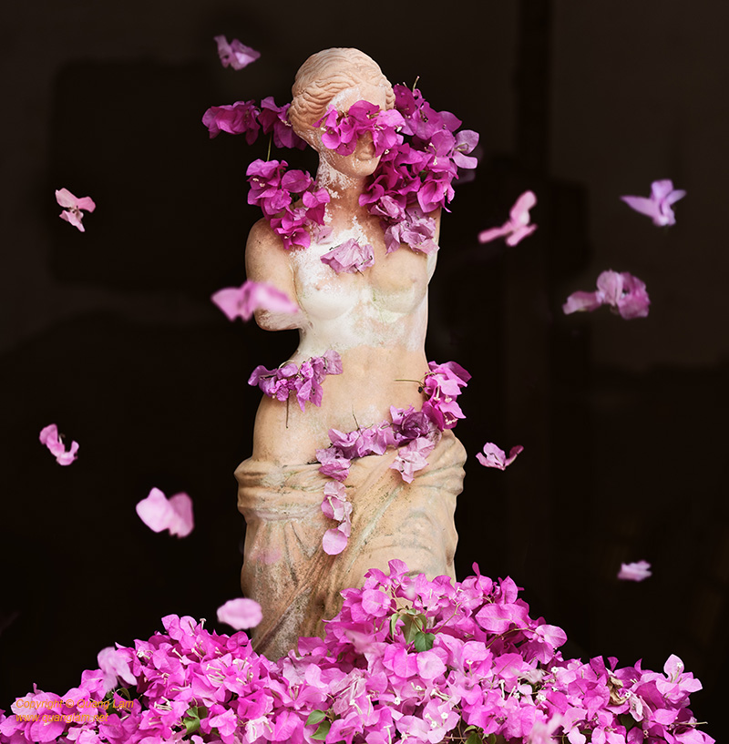 In the same spirit of appropriation, this photo depicts the Venus as a fashionable sculpture with a real natural dress of Bougainvillea flowers. She is wearing sunglasses which are putting her among of the hottest celebrity of the media world.