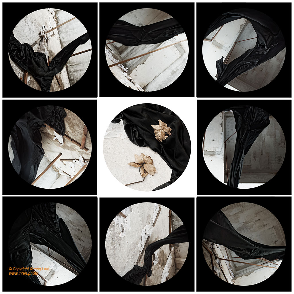 The black floating fabric blown by the wind traced the invisible energy coming into the space delimited by the wooden blocks as minimal sculptures